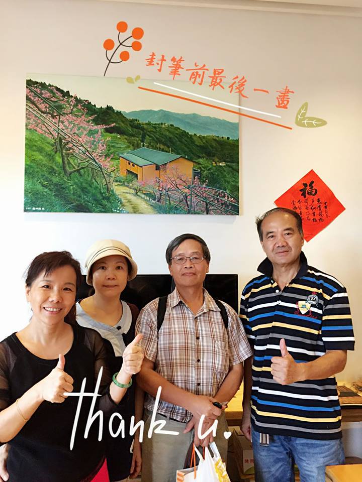 吳爸: 是常駐在大溪老街的街頭藝術家- 黃政魁老師(照片中右二)要封筆前,因為我們開口問所畫的最後一幅油畫