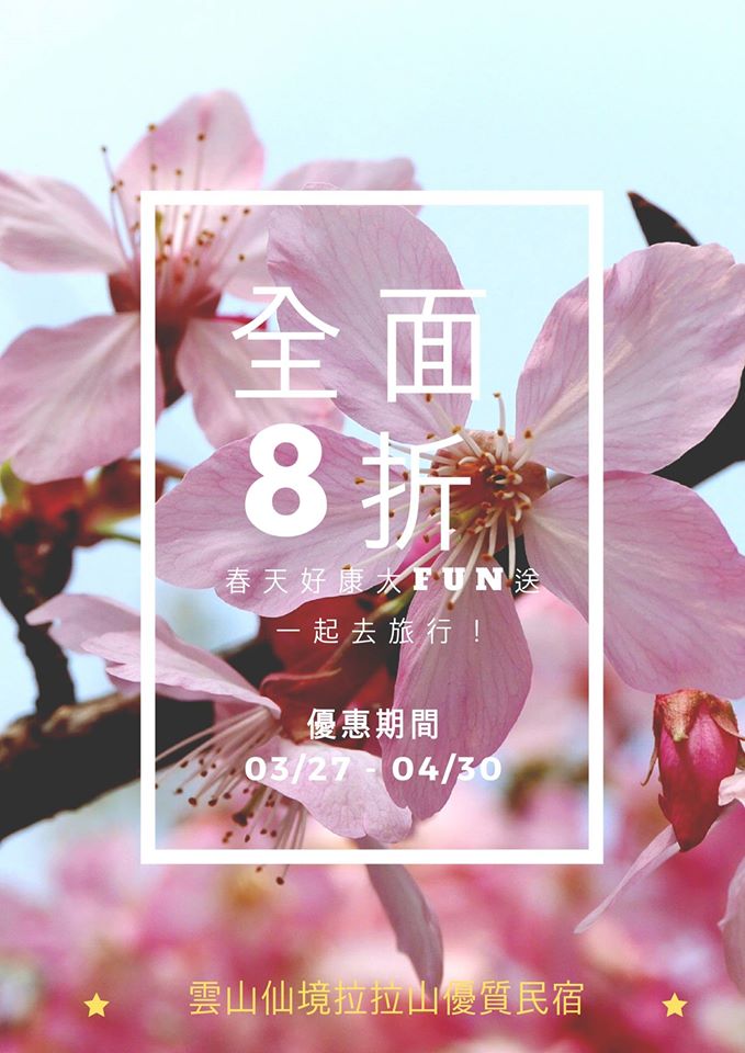 活動詳情:只要活動期間,在臉書按讚雲山仙境民宿粉絲網及打卡po文,就可以享有此優惠喔! ^0^
