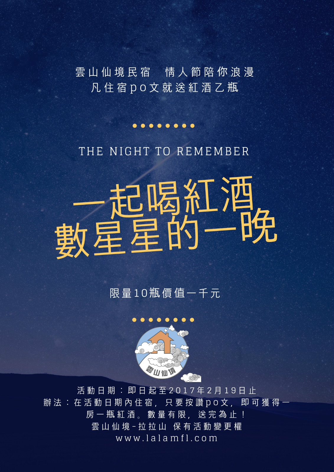即日起到2/19止入住雲山仙境,並po文按讚就可獲得紅酒乙瓶,哇!我說也不用這麼重本吧??和愛人在獨立陽台望著山景,配紅酒數星星,超浪漫的啦!限量十瓶,送完為止!快播 0953 515083 找吳媽媽訂房。